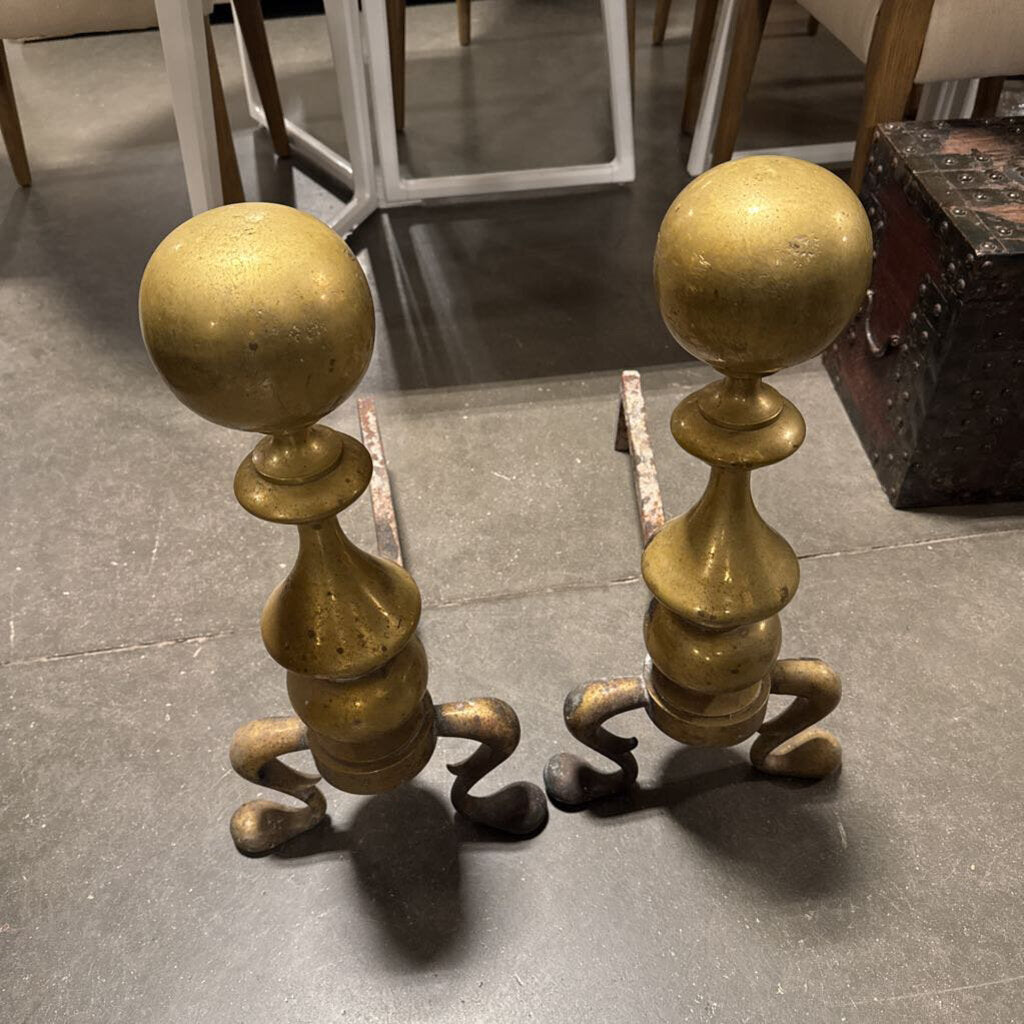 Vintage Brass Round Top Andirons- Pair- 19X9X22H